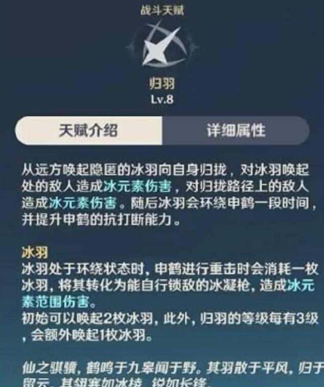 3、冰羽处于环绕状态时,申鹤进行重击时会消耗一枚冰羽,将其转化为能自行锁敌的冰凝枪,造成冰元素范围伤害。初始可以唤起2枚冰羽,此外,归羽的等级每有3级,会额外唤起1枚冰羽。